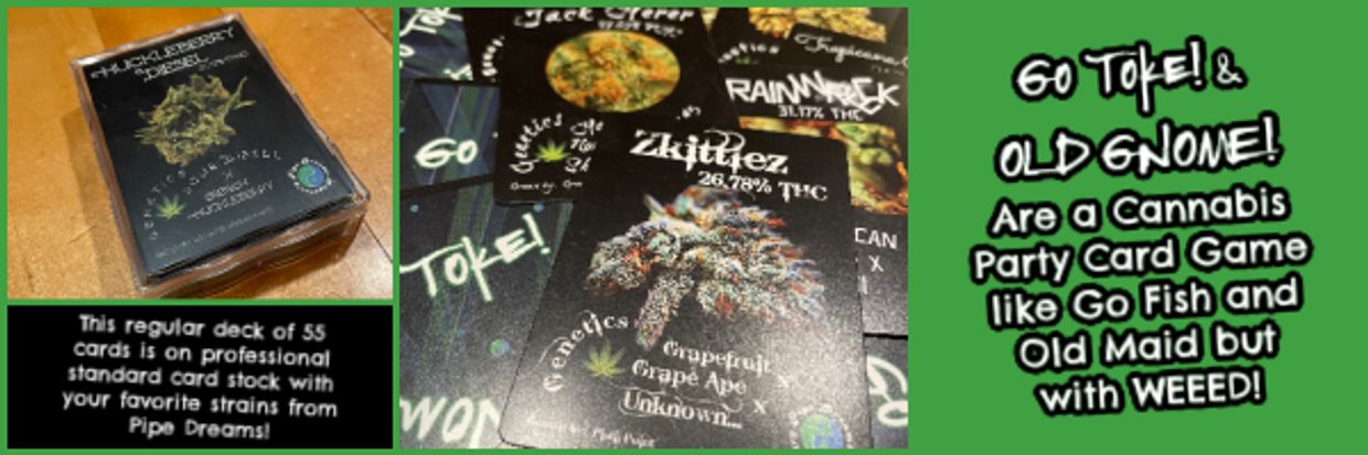 Custom cannabis card game of GO TOKE! and OLD GNOME! all in one game with original art and photos. A fun twist on traditional Go Fish & Old Maid. Party favorite or just a time killer! Each pair is an actual photo from our dispensary on the Oregon Coast @ Pipe Dreams! Each card features the genetics, grower and the THC percentage. Each deck of 55 is professional standard card stock with a smooth finish and contains a blue core center to prevent transparency. Drift down memory lane with some of your favorite strains throughout the years. Designed and created by keli.